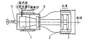 加工坦克發(fā)動(dòng)機(jī)缸套的最后一道工序——珩磨工序的質(zhì)量和精度要求較高,其中要求內(nèi)孔尺寸精度IT6級,內(nèi)孔圓度0.015mm,平行度0.03mm(由上道工序保證),表面粗糙度Ra0.05μm。采用傳統(tǒng)珩磨工藝加工時(shí),產(chǎn)品質(zhì)量不穩(wěn)定,難以達(dá)到精度要求。為解決這一問題,筆者研制了直徑f150mm的超聲珩磨系統(tǒng)樣機(jī),采用該珩磨機(jī)樣機(jī)的缸套試件可滿足加工技術(shù)要求。 1、樣機(jī)結(jié)構(gòu)原理 本樣機(jī)是根據(jù)兵總616廠的生產(chǎn)要求立項(xiàng)預(yù)研的。樣機(jī)的超聲珩磨系統(tǒng)結(jié)構(gòu)見圖。系統(tǒng)由超聲波發(fā)生器、頻率計(jì)、超聲珩磨裝置等組成。超聲珩磨裝置由聲振系統(tǒng)(換能器、變幅桿、工具聲振系統(tǒng))、珩磨頭部、漲芯部、動(dòng)力傳遞部、碳刷、浮動(dòng)連接部、機(jī)殼部等組成,其工作原理是由超聲波發(fā)生器將50Hz交流電轉(zhuǎn)換為超聲頻的電振蕩,由換能器將超聲頻的電振蕩轉(zhuǎn)換為超聲頻的機(jī)械振動(dòng)。由于該機(jī)械振動(dòng)振幅較小,僅為4μm左右,不能直接用于機(jī)械加工,因此需要通過變幅桿將振幅放大,并將振動(dòng)傳給聲振子系統(tǒng),由聲振子系統(tǒng)帶動(dòng)其上的油石產(chǎn)生縱向振動(dòng),從而實(shí)現(xiàn)在普通珩磨基礎(chǔ)上附加超聲振動(dòng)的超聲振動(dòng)珩磨加工。